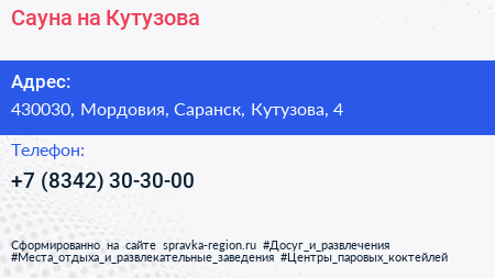 Сауна на Кутузова по адресу 430030, Мордовия, Саранск, Кутузова, 4 в дальнейшем Организация, размещена в следующих категориях: