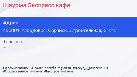 Шаурма-Экспресс, кафе по адресу 430001, Мордовия, Саранск, Строительная, 3 ст1 в дальнейшем Организация, размещена в следующих категориях: