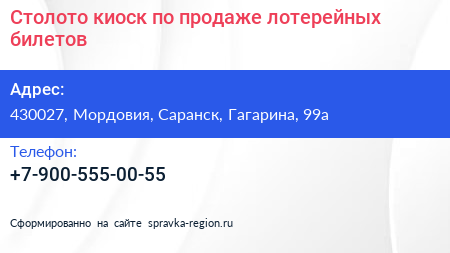 Столото, киоск по продаже лотерейных билетов по адресу 430027, Мордовия, Саранск, Гагарина, 99а в дальнейшем Организация, размещена в следующих категориях: