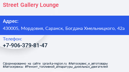 Street Gallery Lounge по адресу 430005, Мордовия, Саранск, Богдана Хмельницкого, 42а в дальнейшем Организация, размещена в следующих категориях: