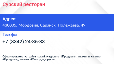 Сурский, ресторан по адресу 430005, Мордовия, Саранск, Полежаева, 49 в дальнейшем Организация, размещена в следующих категориях:
