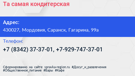 Та самая, кондитерская по адресу 430027, Мордовия, Саранск, Гагарина, 99а в дальнейшем Организация, размещена в следующих категориях: