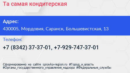 Та самая, кондитерская по адресу 430005, Мордовия, Саранск, Большевистская, 13 в дальнейшем Организация, размещена в следующих категориях:
