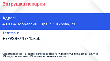 Ватрушка, пекарня по адресу 430004, Мордовия, Саранск, Кирова, 71 в дальнейшем Организация, размещена в следующих категориях: