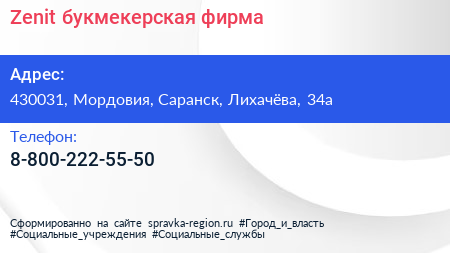Zenit, букмекерская фирма по адресу 430031, Мордовия, Саранск, Лихачёва, 34а в дальнейшем Организация, размещена в следующих категориях: