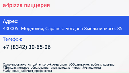 a4pizza, пиццерия по адресу 430005, Мордовия, Саранск, Богдана Хмельницкого, 35 в дальнейшем Организация, размещена в следующих категориях: