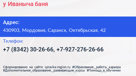 у Иваныча, баня по адресу 430903, Мордовия, Саранск, Октябрьская, 42 в дальнейшем Организация, размещена в следующих категориях: