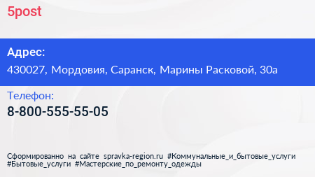 5post по адресу 430027, Мордовия, Саранск, Марины Расковой, 30а в дальнейшем Организация, размещена в следующих категориях: