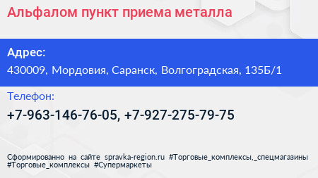 Альфалом, пункт приема металла по адресу 430009, Мордовия, Саранск, Волгоградская, 135Б/1 в дальнейшем Организация, размещена в следующих категориях: