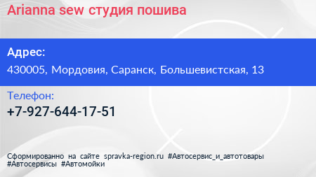 Arianna.sew, студия пошива по адресу 430005, Мордовия, Саранск, Большевистская, 13 в дальнейшем Организация, размещена в следующих категориях: