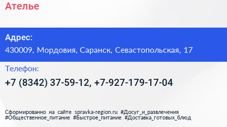 Ателье по адресу 430009, Мордовия, Саранск, Севастопольская, 17 в дальнейшем Организация, размещена в следующих категориях: