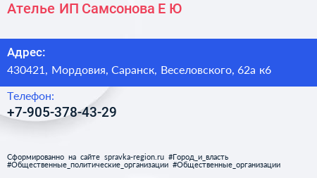 Ателье, ИП Самсонова Е.Ю. по адресу 430421, Мордовия, Саранск, Веселовского, 62а к6 в дальнейшем Организация, размещена в следующих категориях:
