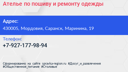 Ателье по пошиву и ремонту одежды по адресу 430005, Мордовия, Саранск, Маринина, 19 в дальнейшем Организация, размещена в следующих категориях: