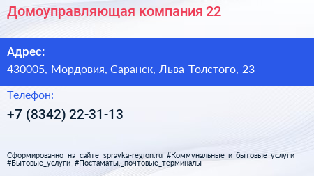 Домоуправляющая компания №22 по адресу 430005, Мордовия, Саранск, Льва Толстого, 23 в дальнейшем Организация, размещена в следующих категориях: