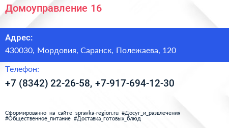 Домоуправление №16 по адресу 430030, Мордовия, Саранск, Полежаева, 120 в дальнейшем Организация, размещена в следующих категориях: