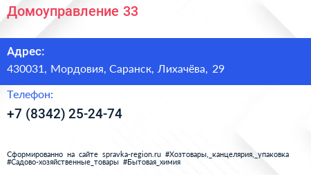 Домоуправление №33 по адресу 430031, Мордовия, Саранск, Лихачёва, 29 в дальнейшем Организация, размещена в следующих категориях: