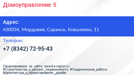 Домоуправление №5 по адресу 430034, Мордовия, Саранск, Коваленко, 11 в дальнейшем Организация, размещена в следующих категориях: