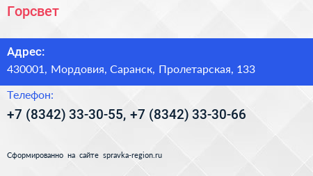 Горсвет по адресу 430001, Мордовия, Саранск, Пролетарская, 133 в дальнейшем Организация, размещена в следующих категориях: