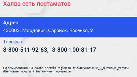 Халва, сеть постаматов по адресу 430003, Мордовия, Саранск, Васенко, 9 в дальнейшем Организация, размещена в следующих категориях: