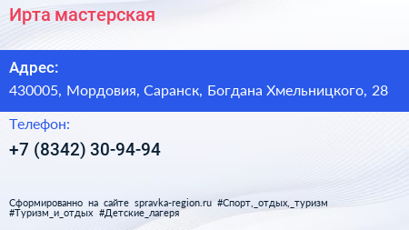 Ирта, мастерская по адресу 430005, Мордовия, Саранск, Богдана Хмельницкого, 28 в дальнейшем Организация, размещена в следующих категориях: