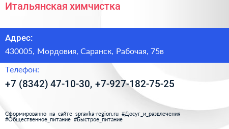 Итальянская химчистка по адресу 430005, Мордовия, Саранск, Рабочая, 75в в дальнейшем Организация, размещена в следующих категориях: