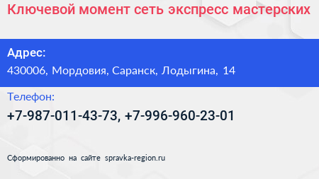 Ключевой момент, сеть экспресс-мастерских по адресу 430006, Мордовия, Саранск, Лодыгина, 14 в дальнейшем Организация, размещена в следующих категориях:
