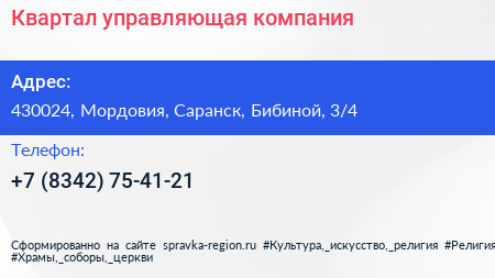 Квартал, управляющая компания по адресу 430024, Мордовия, Саранск, Бибиной, 3/4 в дальнейшем Организация, размещена в следующих категориях: