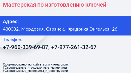 Мастерская по изготовлению ключей по адресу 430032, Мордовия, Саранск, Фридриха Энгельса, 26 в дальнейшем Организация, размещена в следующих категориях: