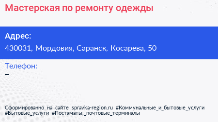 Мастерская по ремонту одежды по адресу 430031, Мордовия, Саранск, Косарева, 50 в дальнейшем Организация, размещена в следующих категориях: