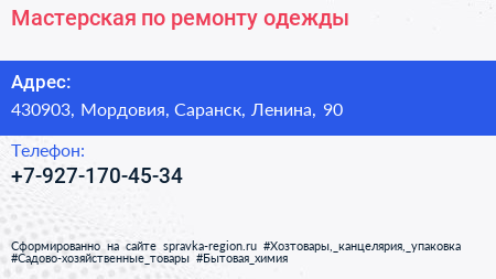 Мастерская по ремонту одежды по адресу 430903, Мордовия, Саранск, Ленина, 90 в дальнейшем Организация, размещена в следующих категориях: