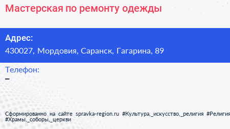 Мастерская по ремонту одежды по адресу 430027, Мордовия, Саранск, Гагарина, 89 в дальнейшем Организация, размещена в следующих категориях: