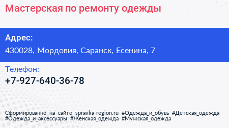 Мастерская по ремонту одежды по адресу 430028, Мордовия, Саранск, Есенина, 7 в дальнейшем Организация, размещена в следующих категориях: