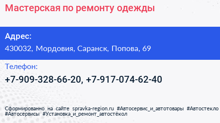 Мастерская по ремонту одежды по адресу 430032, Мордовия, Саранск, Попова, 69 в дальнейшем Организация, размещена в следующих категориях: