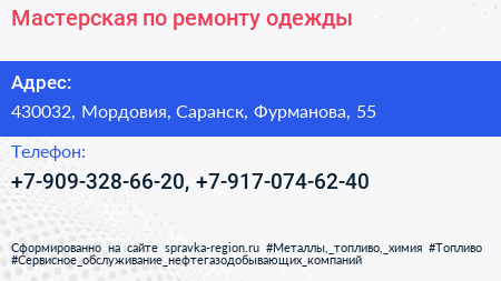 Мастерская по ремонту одежды по адресу 430032, Мордовия, Саранск, Фурманова, 55 в дальнейшем Организация, размещена в следующих категориях: