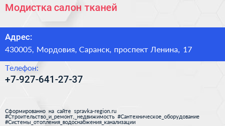 Модистка, салон тканей по адресу 430005, Мордовия, Саранск, проспект Ленина, 17 в дальнейшем Организация, размещена в следующих категориях: