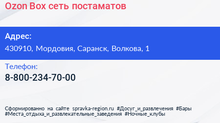 Ozon Box, сеть постаматов по адресу 430910, Мордовия, Саранск, Волкова, 1 в дальнейшем Организация, размещена в следующих категориях: