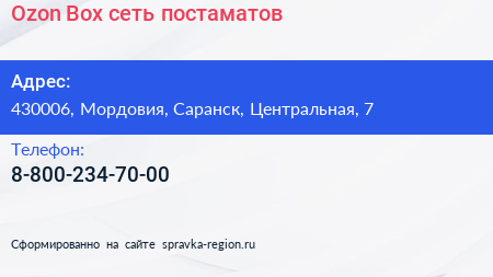 Ozon Box, сеть постаматов по адресу 430006, Мордовия, Саранск, Центральная, 7 в дальнейшем Организация, размещена в следующих категориях: