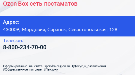 Ozon Box, сеть постаматов по адресу 430009, Мордовия, Саранск, Севастопольская, 128 в дальнейшем Организация, размещена в следующих категориях: