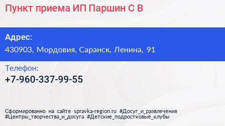 Пункт приема, ИП Паршин С.В. по адресу 430903, Мордовия, Саранск, Ленина, 91 в дальнейшем Организация, размещена в следующих категориях: