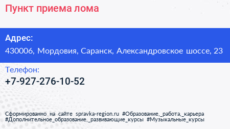 Пункт приема лома по адресу 430006, Мордовия, Саранск, Александровское шоссе, 23 в дальнейшем Организация, размещена в следующих категориях:
