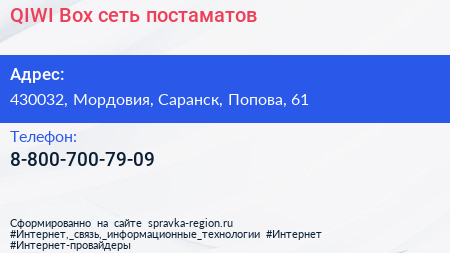 QIWI Box, сеть постаматов по адресу 430032, Мордовия, Саранск, Попова, 61 в дальнейшем Организация, размещена в следующих категориях: