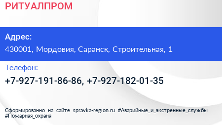 РИТУАЛПРОМ по адресу 430001, Мордовия, Саранск, Строительная, 1 в дальнейшем Организация, размещена в следующих категориях: