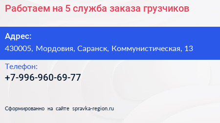 Работаем на 5, служба заказа грузчиков по адресу 430005, Мордовия, Саранск, Коммунистическая, 13 в дальнейшем Организация, размещена в следующих категориях: