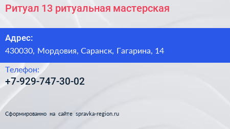 Ритуал 13, ритуальная мастерская по адресу 430030, Мордовия, Саранск, Гагарина, 14 в дальнейшем Организация, размещена в следующих категориях:
