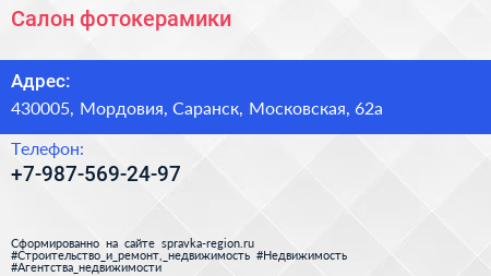 Салон фотокерамики по адресу 430005, Мордовия, Саранск, Московская, 62а в дальнейшем Организация, размещена в следующих категориях: