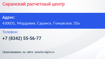 Саранский расчетный центр по адресу 430031, Мордовия, Саранск, Гожувская, 35а в дальнейшем Организация, размещена в следующих категориях: