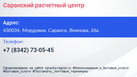 Саранский расчетный центр по адресу 430034, Мордовия, Саранск, Воинова, 26а в дальнейшем Организация, размещена в следующих категориях: