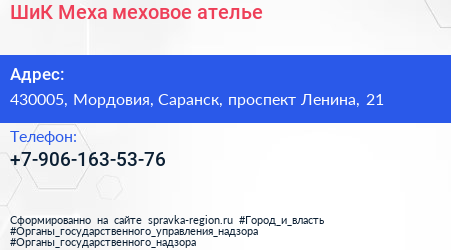 ШиК`Меха, меховое ателье по адресу 430005, Мордовия, Саранск, проспект Ленина, 21 в дальнейшем Организация, размещена в следующих категориях: