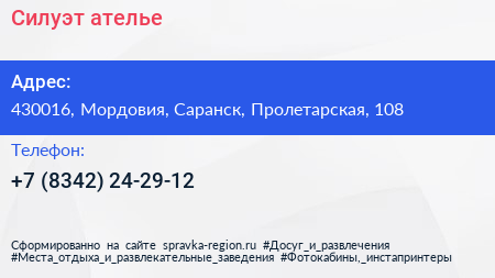 Силуэт, ателье по адресу 430016, Мордовия, Саранск, Пролетарская, 108 в дальнейшем Организация, размещена в следующих категориях: