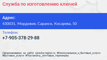 Служба по изготовлению ключей по адресу 430031, Мордовия, Саранск, Косарева, 50 в дальнейшем Организация, размещена в следующих категориях: